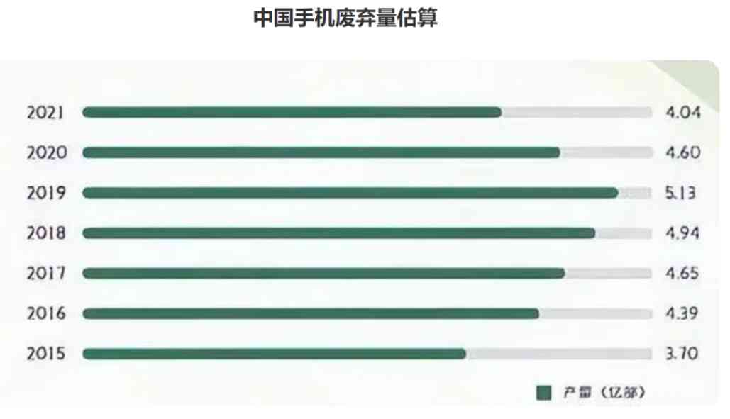 据中国循环经济协会提供的数据显示,2015年我国产生废弃手机为3.70亿部,2019年达到5.13亿部,2021为4.04亿部,近7年来,废弃手机的数量一直维持在3亿部至5亿部,这个数额是相当高的。