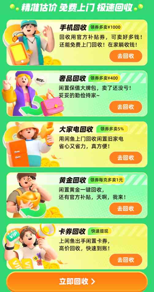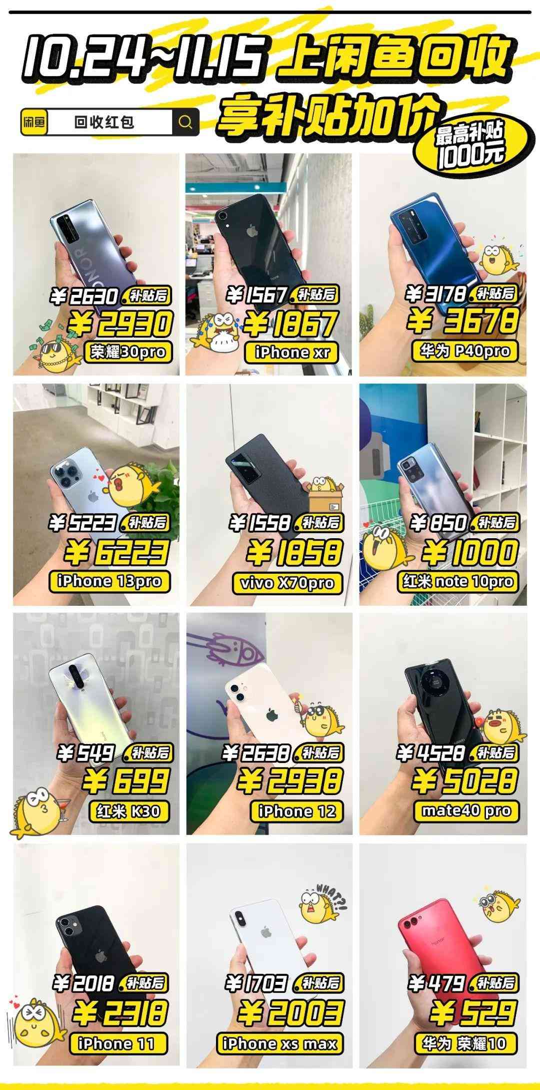从10月25日开始,闲鱼将举办一场回收狂欢,手机,家电、二奢、卡券等均可回收,发布闲置还能享满赠权益,手机回收价满5000元,平台补贴现金1000元!