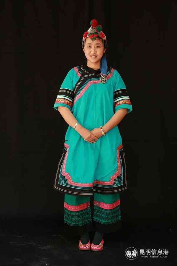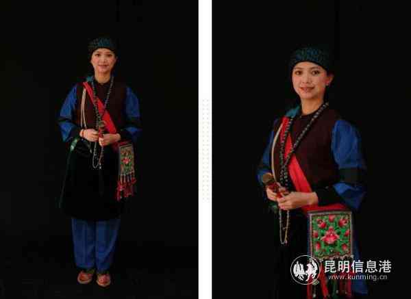 头戴蓝色围巾、黑色纱帕包头,上身穿右祍深色前短后长的长衣,领口、衣边及袖口用黑布条滚边,外穿右祍领褂,胸前挂三须银链。腰系双面绣花把手的黑色素面围腰,下身穿直筒长裤,脚穿船型绣花鞋。肩挂精美的绣花香包,绣花图案精美,色彩艳丽,香包下缀银饰或手工编织毛线装饰。胸前挂一串佛珠,手拿罄铃。