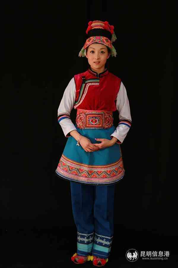头戴风花雪月包头,身穿白色右衽衬衣,衣袖接湖蓝色饰花边袖口,外套红色比甲,腰系黑色绣花镶边大围腰,下身穿绿色长裤,裤脚饰花边,脚著绣花鞋。