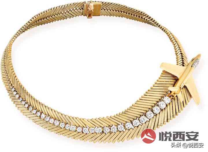1956年,法国著名航空实业家马塞尔·达索( Marcel Dassault )委托Van Cleef & Arpels 梵克雅宝为法国位女试飞员杰奎琳·奥里奥尔( Jacqueline Auriol )精心打造一条项链。1953年作为欧洲位驾驭超音速飞行的女飞行员,她还于1955年驾 驶Mystère IV打破了自己的飞行记录。在唤起这位备受推崇的女性所具备的优雅气质的同时,世家打造的这件项链亦生动展现了杰奎琳对飞行的热爱和用于冒险的精神。Mystère IV项链作品以黄K金制成,生动刻画一架金色飞机的驰骋之姿,而轻巧灵活的人字形结构则营造出飞翔的动态美。点缀于颈部侧面的飞机,以及以由大至小的钻石幻化而成的尾部设计,更让人联想到飞机在天际划出的线状云彩。这件作品于1957年在芳登广场举办的一场典礼上被赠予杰奎琳。它充分彰显世家始终赋予其作品灵动的生命力。
