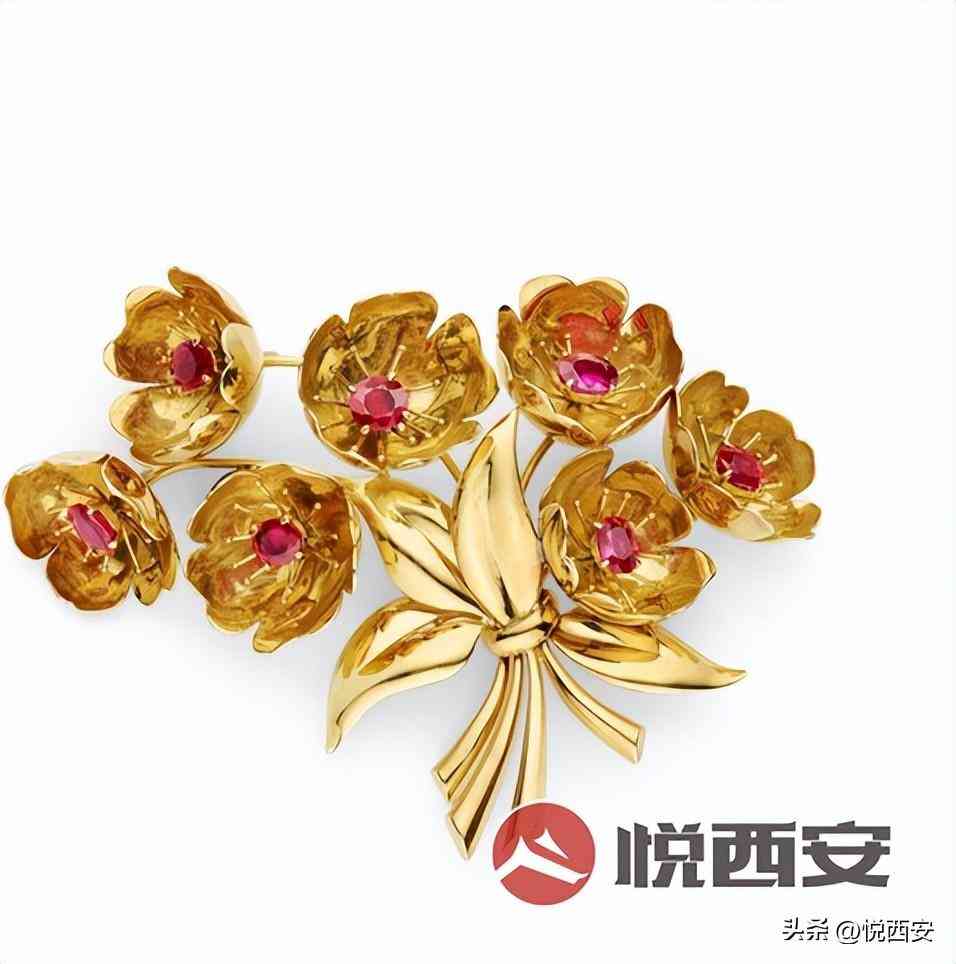 这枚创作于1945年的Buttercupbouquet胸针,以不规则的线条生动勾勒花卉在微风中摇曳生姿的美态。经镜面抛光的花冠及黄K金打造的叶片簇拥着红宝石花蕊,映照出缤纷璀璨的奕奕神采。