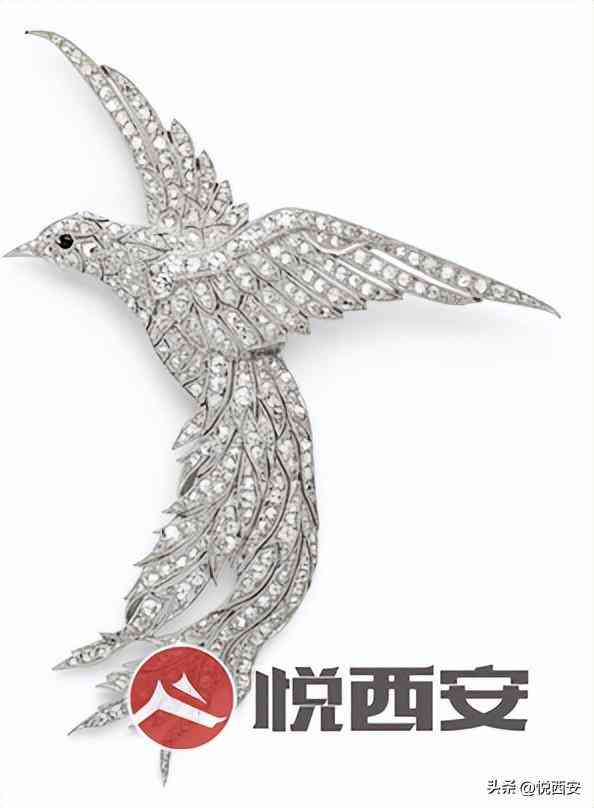 这枚于1927年面世的胸针完美反映当时流行的白钻珠宝设计美学,以铺镶钻石 的铂金演绎天堂鸟的绰约风姿。翅膀和尾羽栩栩如生,乌黑缟玛瑙制成的眼睛炯炯有神,生动呈现飞鸟翱翔展翅的神韵。