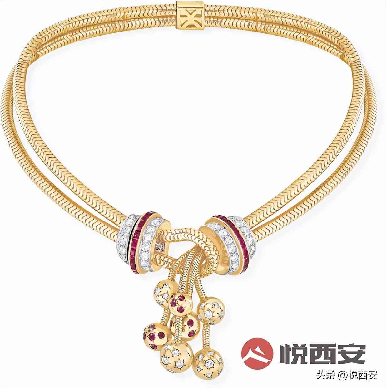 圆润的金珠落在颈间,宛如饰于窗帘上的流苏。金珠随律动摇曳,款款动人,如同谱写一曲清泠动人的乐章。项链其上的镶嵌成星形的红宝石和钻石,熠熠星光,与镶嵌宝石的链扣和两个抽象的珠宝图案交相辉映,为这款项链增添珠宝韵律的光彩。