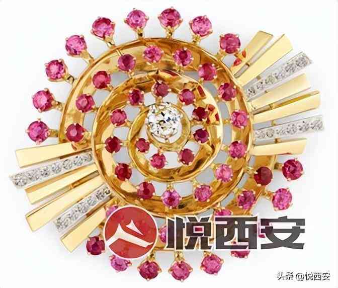 这枚1942年面世的胸针设计充满奇妙巧思,抽象的造型汲取欧普艺术风格,令人 联想起浩瀚苍穹中的一朵星云。金质缎带勾勒的弧线,构成旋涡的意象,表达出强烈而深邃的立体感。错落有致的红宝石将目光吸引至中央主石,赋予构图丰富动感。