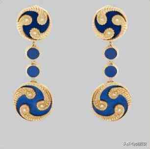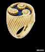 此珠宝套件中每一件珠宝均饰有一个或数个圆形主题图案,以青金石镶嵌而成, 黄K金细节点缀其中。其设计令人联想至璀璨流星,顶部为一颗华美的钻石,末端则由黄K金雕刻而成。如漩涡状的构图洋溢动感,对比色彩浓郁的材质将抽象的设计演绎得生动传神:深蓝色的青金石夜空中,黄K金和钻石如星尘闪耀,宝石内的黄铁矿,宛如星光洒遍浩瀚的银河。