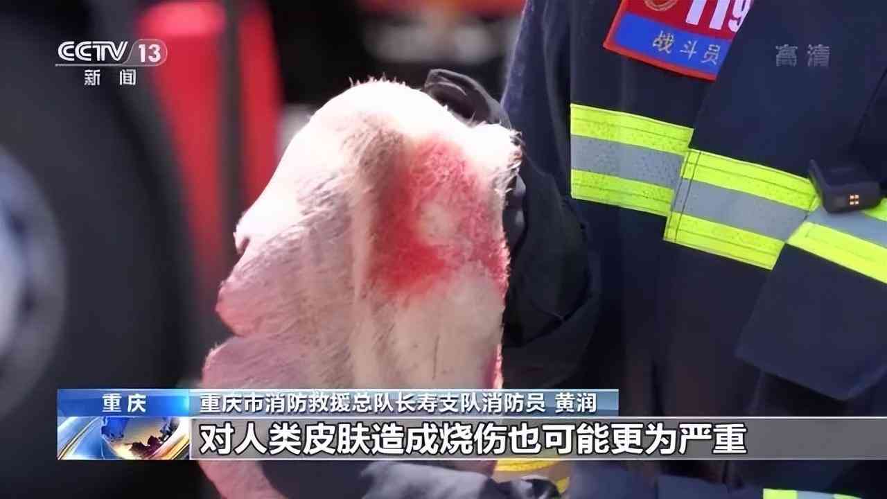 重庆市消防救援总队长寿支队消防员黄润:在户外有风的情况下,每块猪皮的燃烧过程都持续了五秒钟以上。可以看到,猪皮上出现了大片的烧焦的区域。如果是在车内密闭空间内被点燃,有可能发生轰燃,对人类皮肤造成的烧伤也可能更严重。