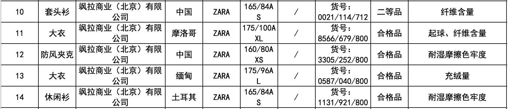 抽查结果显示,由飒拉商业(北京)有限公司生产的5批次ZARA服饰不合格,包括2批次大衣、1批次休闲衫、1批次防风夹克和1批次套头衫,涉及的问题有纤维含量、耐湿摩擦色牢度等。