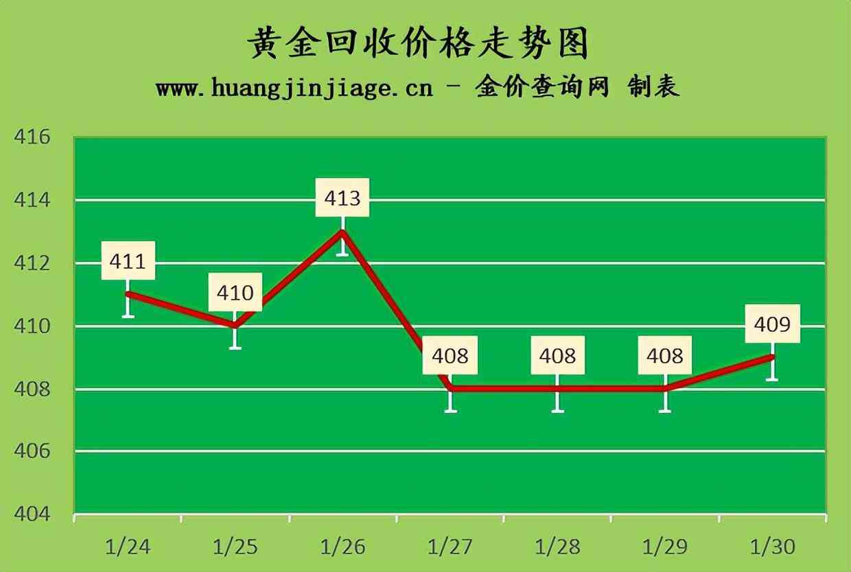 黄金回收价格409元/克,铂金回收价格193元/克,钯金回收价格316元/克,18K金回收价格298元/克,银条回收价格3.8元/克。(黄金行情是波动的,回收金价没有固定标准。)