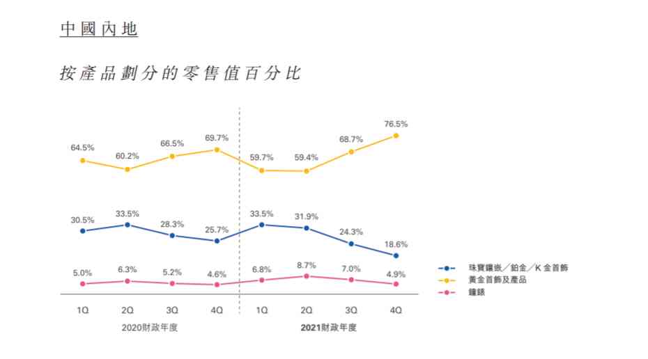 周大福今年一季度未经审核的主要经营数据显示,零售值同比增长152.6%,其中内地零售值同比增长173.7%,占集团零售值百分比为90.3%。黄金首饰及产品的零售需求回升,尤其是农历新年期间,推动季内产品类别的同店销售增长159.8%。