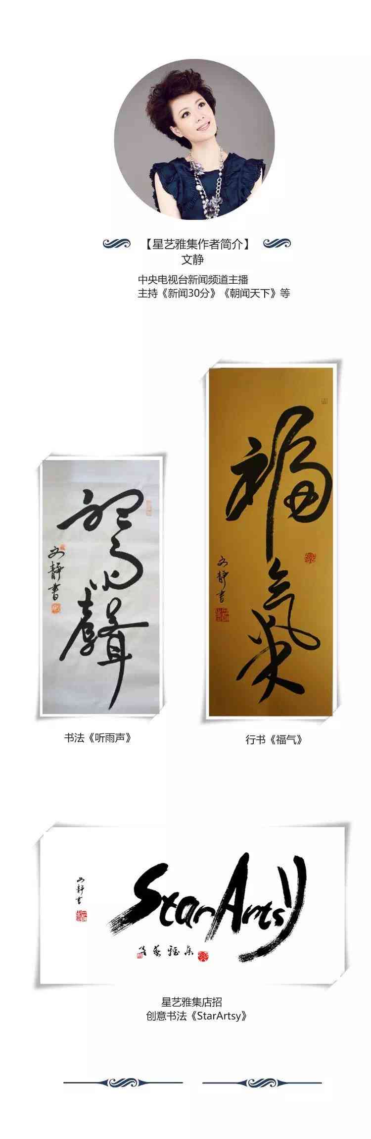 遒劲清逸的草篆、意境悠远的油画、封门青的手工篆刻印章……这些风花雪月,可能和电视镜头里正襟危坐的新闻主播联系不起来,可最近,偏偏就有这样一家“既公益又文艺”的小店,悄然出现在了淘宝上,让人们看到了电视明星的另一面。