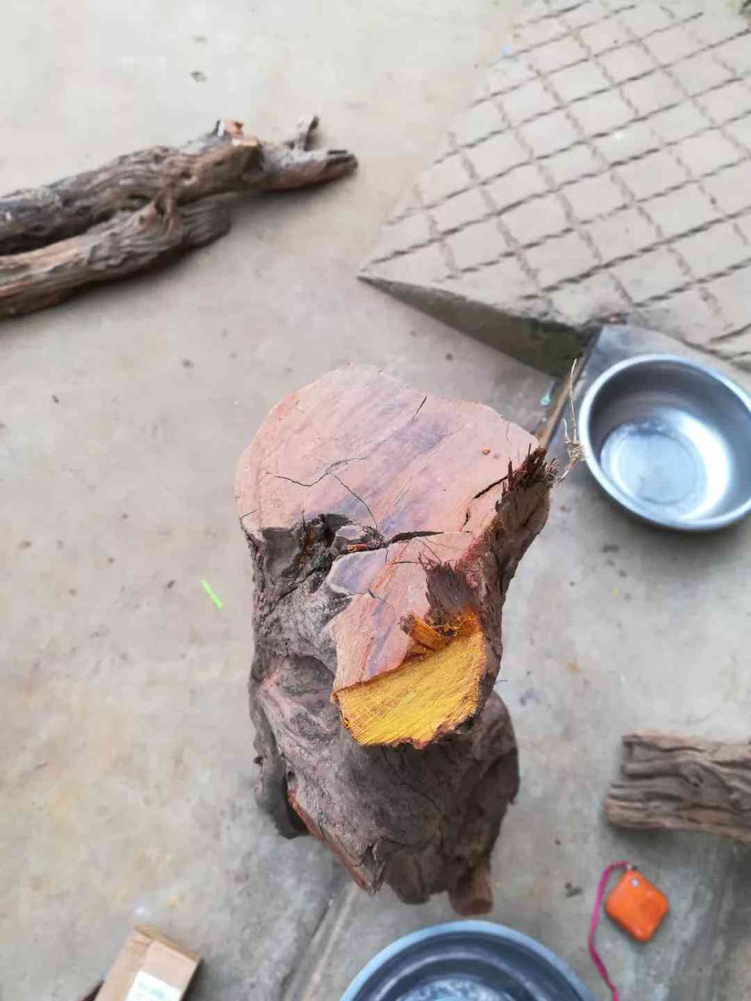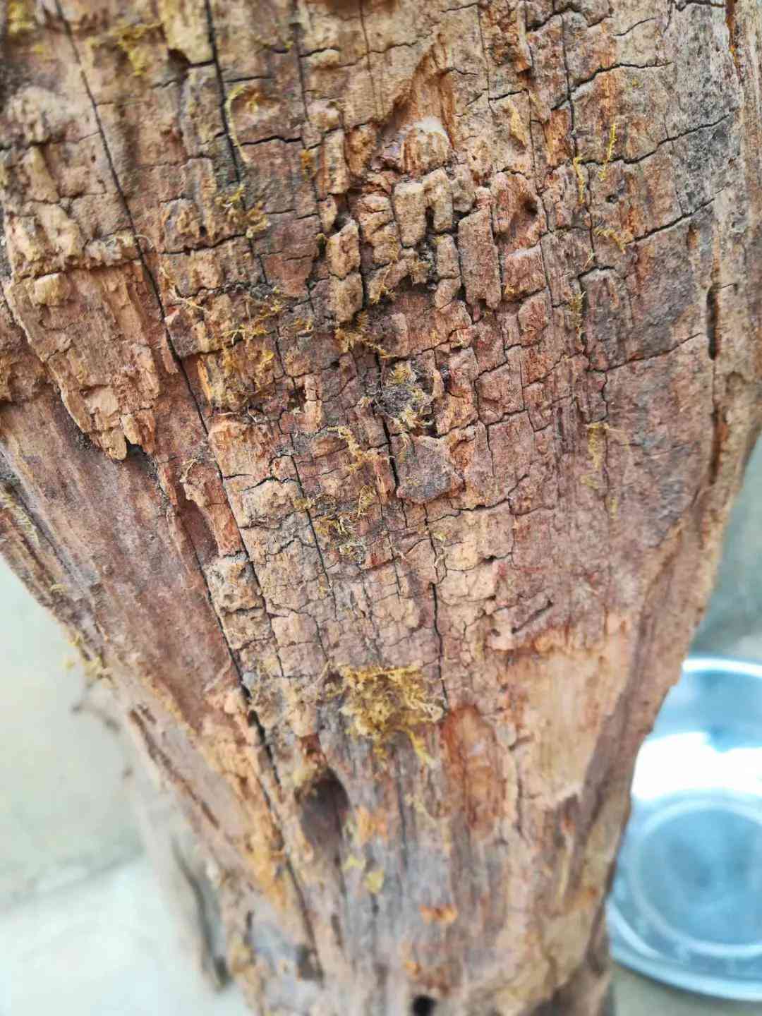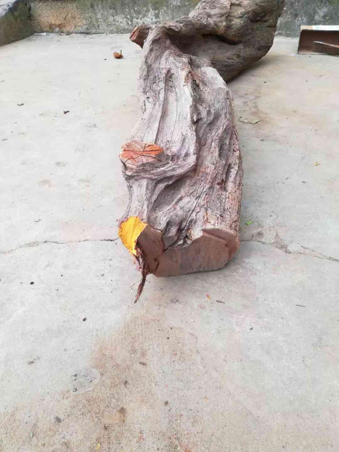 种种原因这一放就是好几年,前几天闲来无事又翻到这根木头,就把它锯了准备当烤火柴,几锯子下去我就发现锯出的锯末金光闪闪。赶紧停下来,索性又在一头用锯子开了窗,当那一小片木块掉下来时,瞬间把我惊艳到了,里面金丝灿灿起着荧光,真是好看…………
