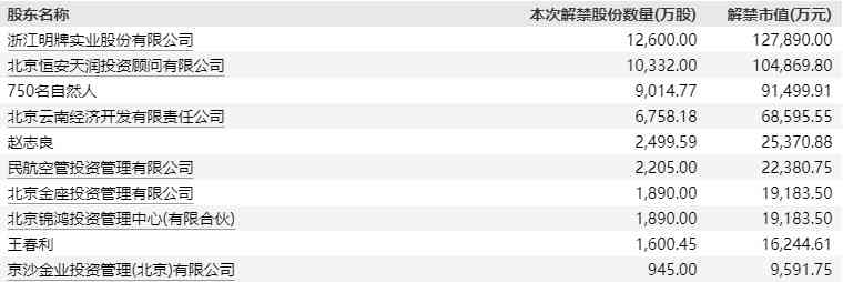 此外,本周解禁数量超过1亿股的公司有11家,前三分别为通裕重工(300185.SZ)、中铁特货(001213.SZ)、菜百股份,解禁数量超过5亿股。
