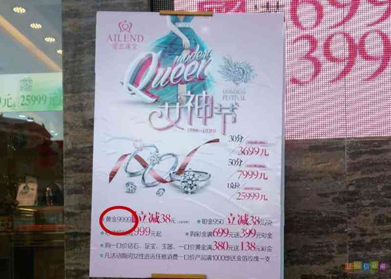 据了解,在消费者购买黄金时,往往以“千足金”、“万足金”为标准判断黄金的优劣,小编在购物中心珠宝店走访时发现,很多珠宝店在消费者选购黄金时仍以“千足金”、“万足金”为卖点,并且价格不等,珠宝店的销售卖点正是为了迎合消费者的选购心理。