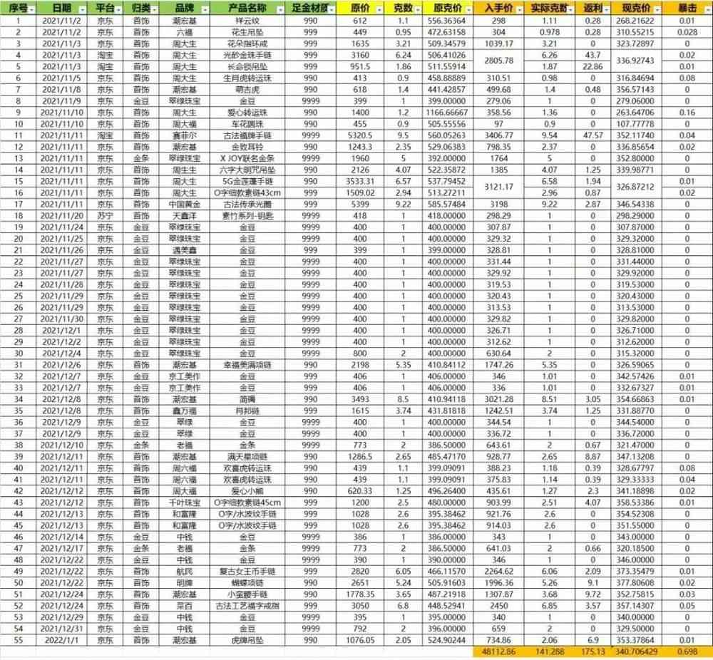 去年双十一,思淮一共薅到了121克黄金饰品,克均价345元。其中70多克,以374元的当日金价换购了古法黄金项链,一来一回,省下近2000元。