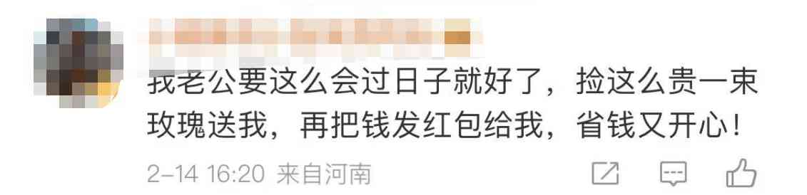 没想到的是,网友们的表现也很“反常”,竟表示非常赞同。一位河南网友就表示,自己老公要是有这么会过日子就好了,“捡一束这么贵的玫瑰送给我,再把钱发红包给我,省钱又开心”。