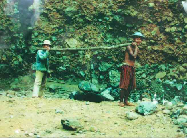 第三种方法是“冲苗”。这种方法适用于矿上地面土层较薄,用水冲即可冲刷掉泥土露出矿藏。场主便利用抽水机引水冲淘,工人跟着抽水机进行挑拣,若发现有大石头暴露,就用铁镐撬棍将石头挖出辨别。这种方法在那莫场区常有人使用。