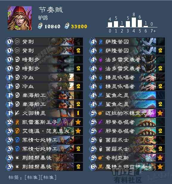 这是一套要兼具控制与爆发输出的盗贼卡组。,新卡“鲨鱼之灵(403-潜行一回合,你随从的战吼和连击都触发两次)”在使用的时候要注意,只能触发两次随从卡的战吼和连击;对于法术牌的“连击”是无效的(对,说的就是你——“冷血”),如果想获得鲨鱼灵buff下“冷血”的效果,建议把一张“邪脊吞噬者”换成“疯狂的药剂师(544-战吼:使一个友方随从+4攻)”。