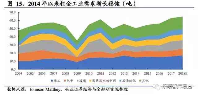 除了2008-2009年全球经济下行阶段出现过较大回落外,铂金的工业需求变动相对稳定,尤其是在2014-2017年,铂金工业需求由50吨/年增长至62.8吨/年,复合增长率7%,需求增长稳健。