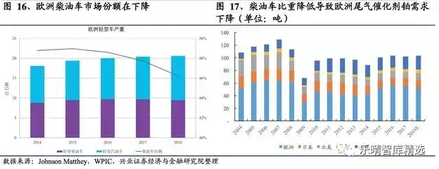 欧洲市场柴油车份额下降导致欧洲尾气催化剂的铂金需求出现下降。