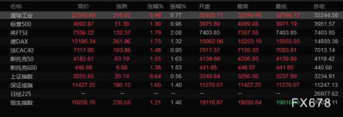 美股收盘情况:道琼斯工业指数上涨0.98%,至32560.6点;标普500指数上涨1.30%,至4002.87点;纳斯达克指数上涨1.58%,至11860.11点。