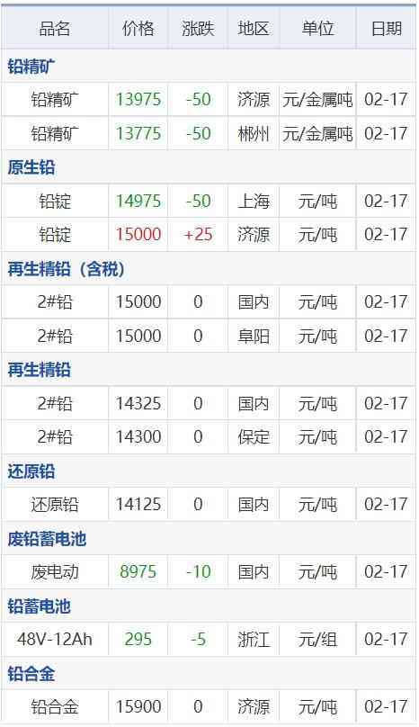 2月17日,铅价继续走弱,炼企报价坚挺,再生铅价格持稳为主,市场还原铅报14000-14150元/吨到厂,再生精铅价格报14300-14350元/吨出厂,含税普遍贴25元/吨,价格报14975-15000元/吨出厂。