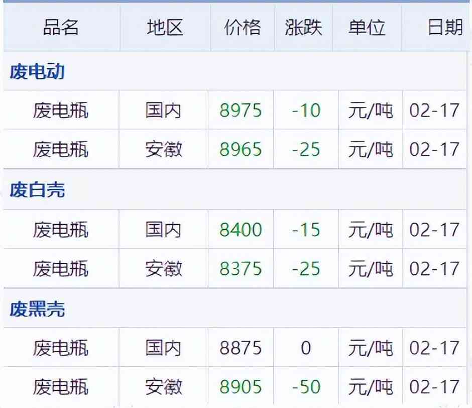 2月17日铅价又跌50元/吨,湖北、湖南地区及江西、安徽个别企业废电瓶价格下调,当前废电动含税价跌至9000元/吨以下。