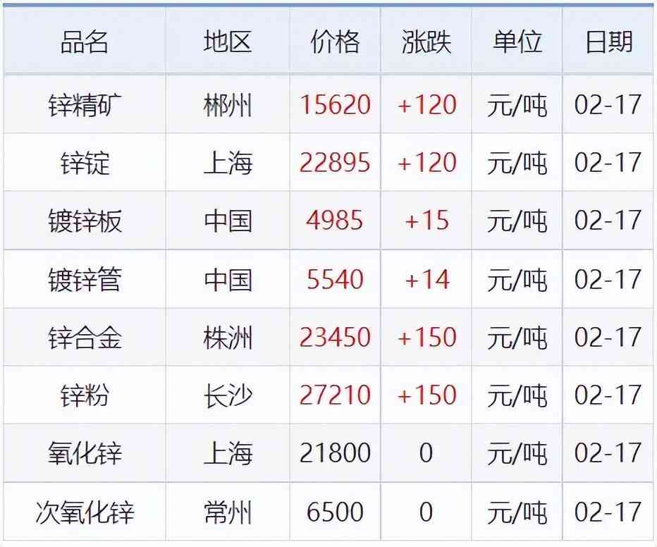 2月17日潍坊99.7%氧化锌现货成交价格20500元/吨,较16日持稳;石家庄99.7%氧化锌现货成交价格21000元/吨,较16日持稳 ;泰州99.7%氧化锌现货成交价格20700元/吨,较16日持稳 ;韶关99.7%纳米氧化锌现货成交价格21000元/吨,较16日持稳 ;上海99.7%氧化锌现货成交价格21800元/吨,较16日持稳 。