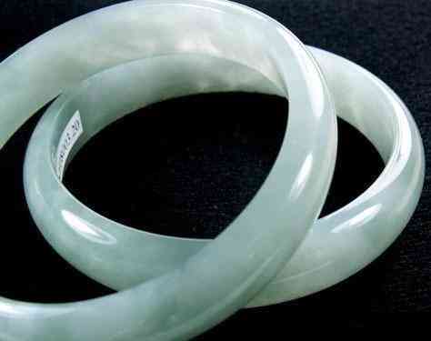 下面这对手镯是真正的冰底A货,絮状飘花之间可以看到很好的水头,颜色淡青纯净,注意:只有老坑的A货才会有如此干净的颜色,新坑料都比较晦暗,而且容易带裂,这里却没有丝毫裂绺,“水差一分,银差十两”,在市场上算得正宗的中高档货色。