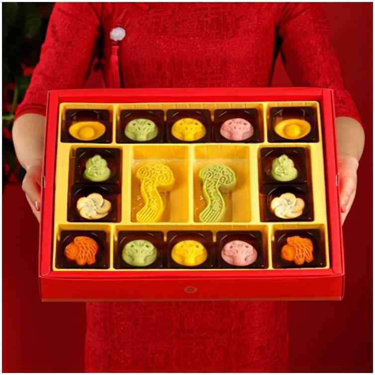 金黄色祥云礼盒,烫金工艺,瑞龙如腾空而起之形,将捆绳绑成特有的龙须之形,更增添几分威严感。礼盒分三层,含北五仁、南五仁、蛋黄莲蓉、奶黄及枣泥味的月饼,综合南北口味,精致选材及包装。
