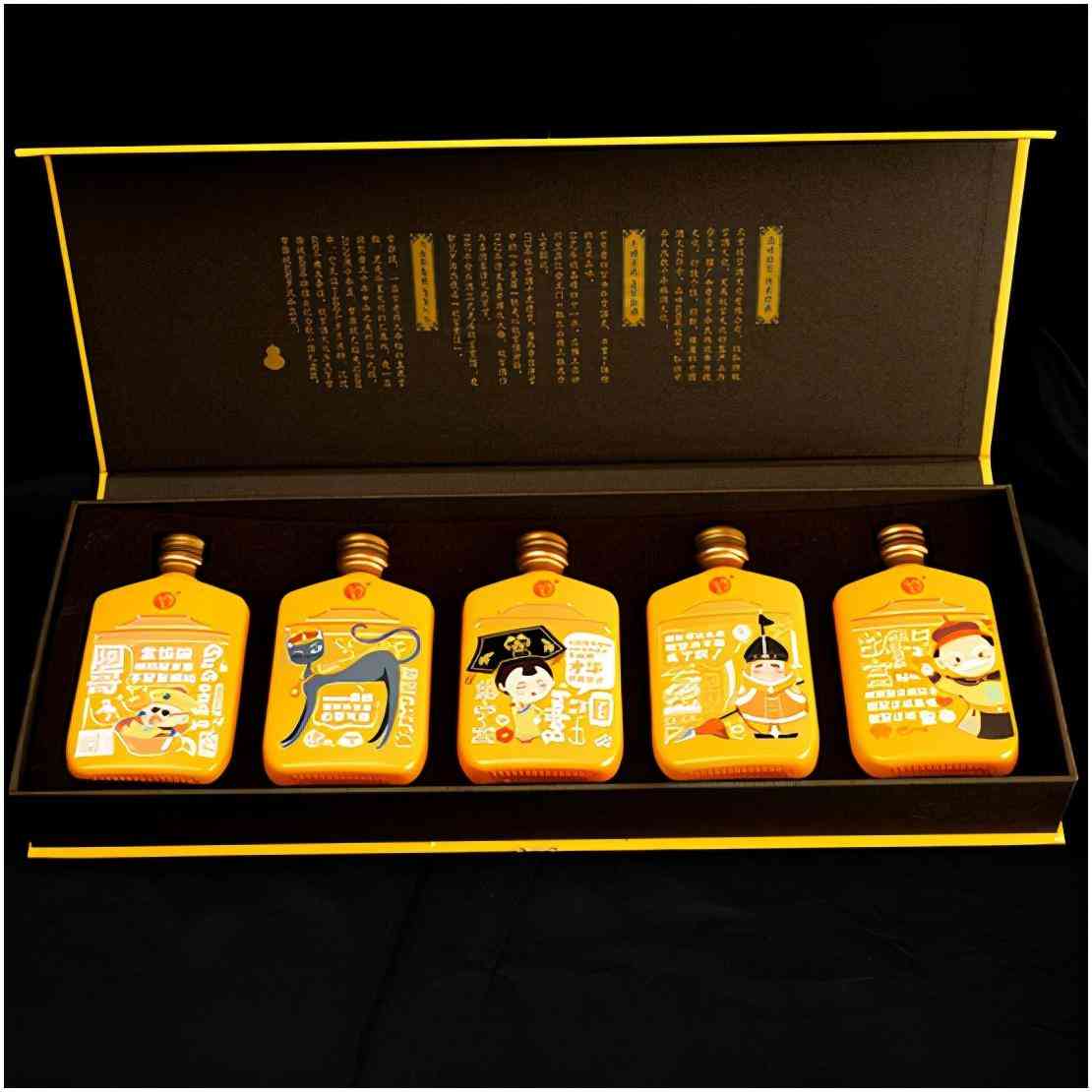 故宫文创酒,用时尚的方式把传统的文化重新流行起来。有五款一套,瓶上印有俏皮生动的话语,深受年轻人的喜欢。