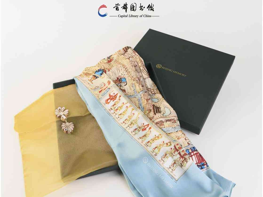 丝巾依托首都图书馆馆藏美国弗兰克•多恩于1936年绘制的地图进行再创造,具体展现了民国时期北平城的历史生活场景,具有极高的史料价值,兼具艺术性、实用性和宣传性。使用真丝材质,手工卷边,双面喷印。