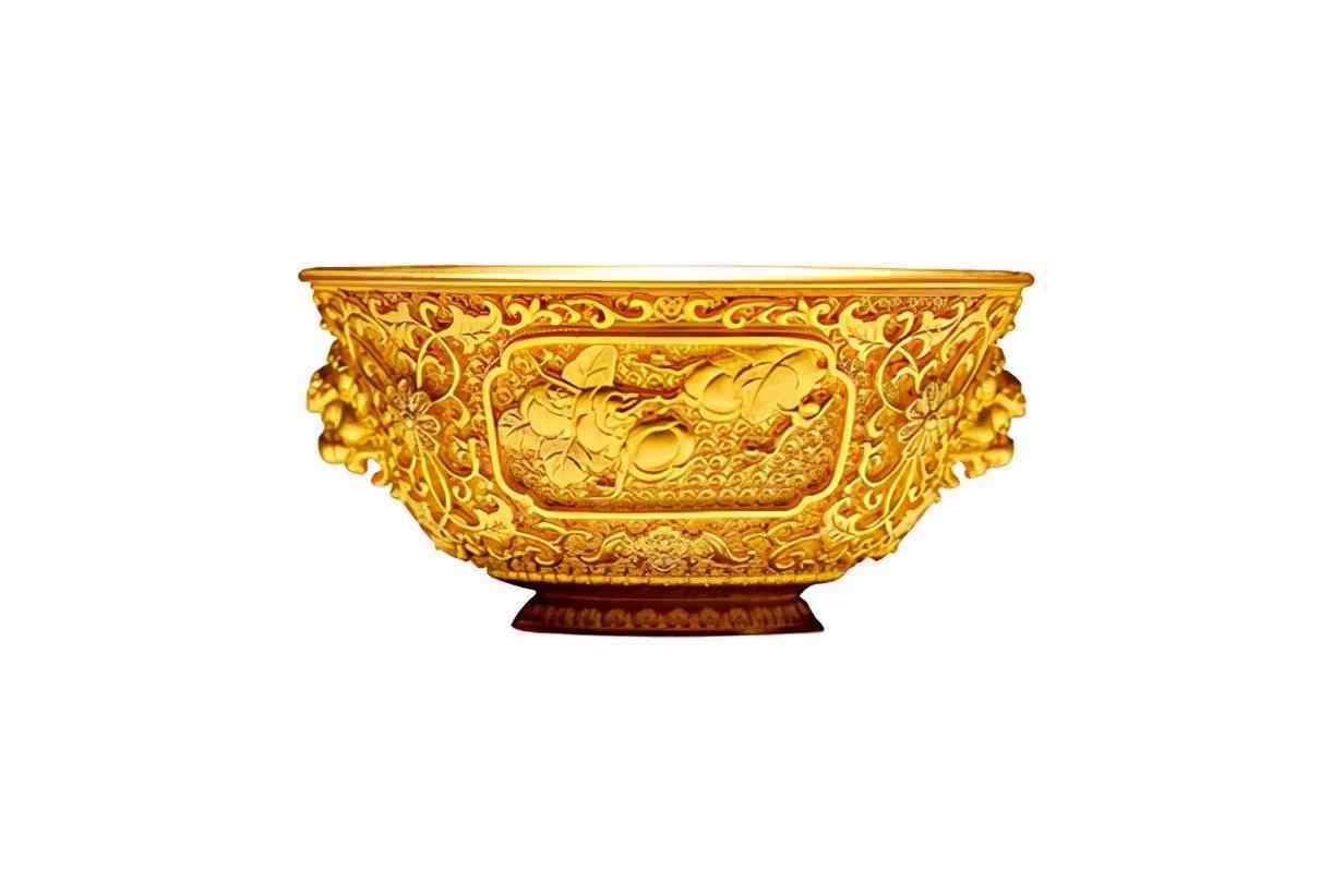 2021年北京台大吉大利黄金“春碗”由中国工艺美术大师赵春明制作。此款产品以宝相花、缠枝纹作为上手活,以螺旋万儿为下手活,下方设计莲花宝座,两面开窗寓意“大吉大利”、“事事如意”。