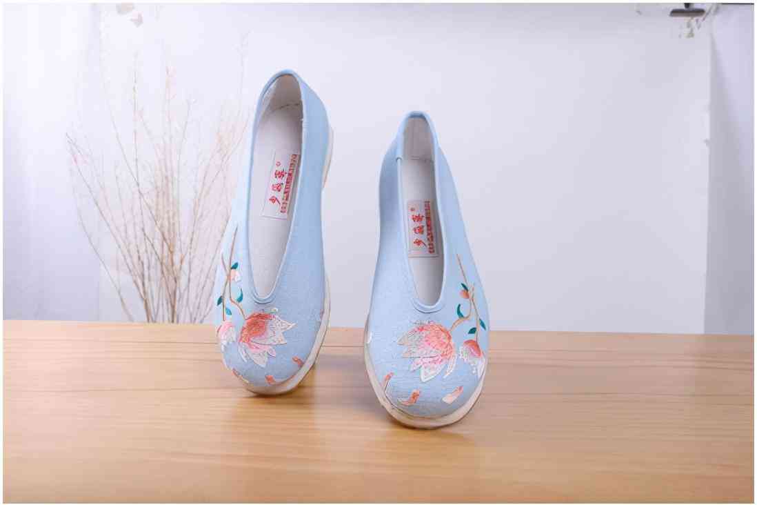 鞋面是布面手工绣荷花,内里布面,鞋底是纯棉布、棉麻制绳纳底,前后贴一层防滑胶片。手工缝制,透气、舒适,适合游园、古装、汉服、休闲、居家、婚礼、宴会。