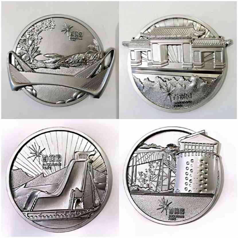采用锌合金、立体浮雕、电镀古镍,以首钢八景为设计灵感,图案设计根据首钢的工业特色进行工业风设计。