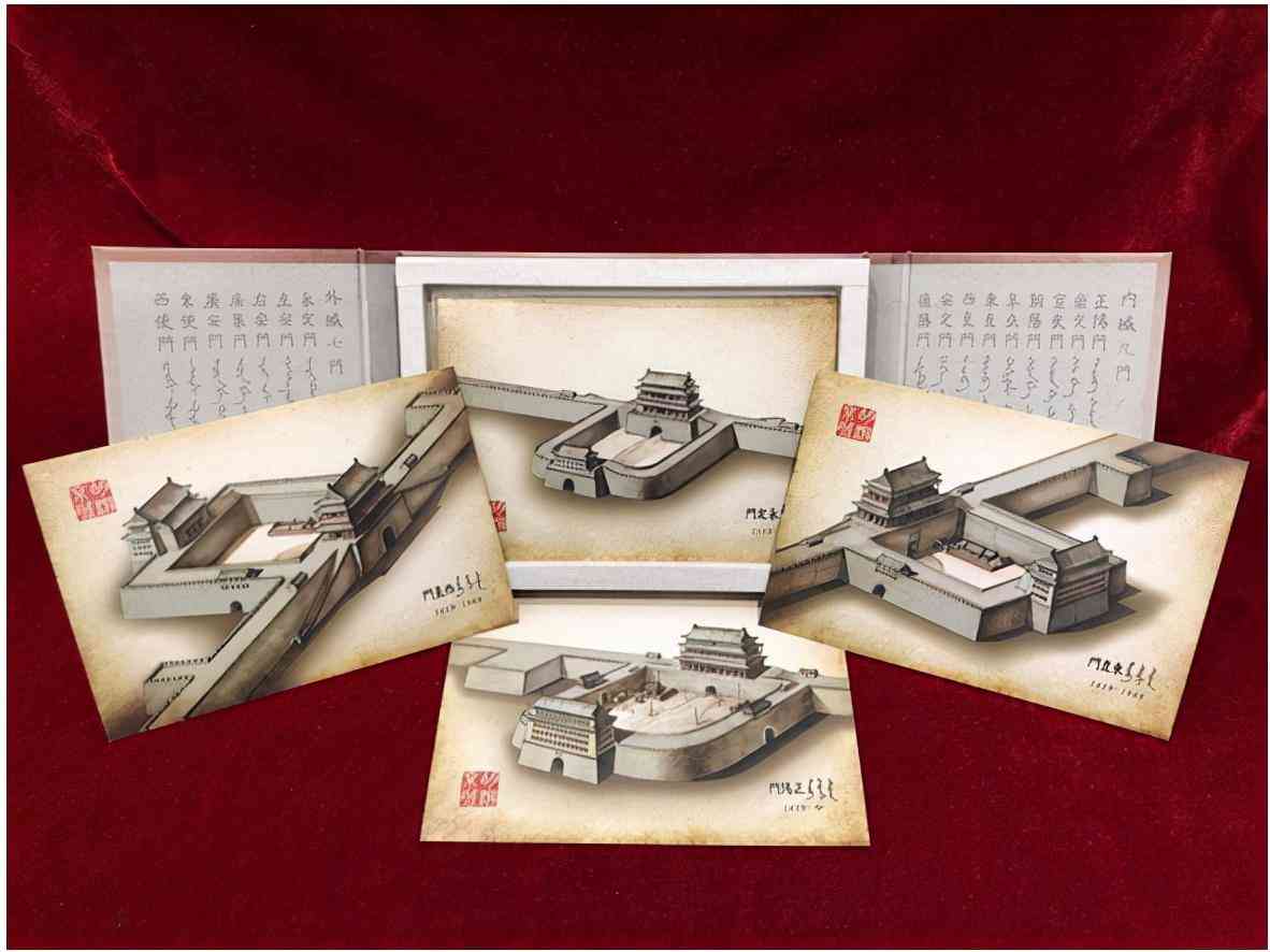 本套明信片以北京城门城墙为设计元素,在参考了上千张城门旧照及喜仁龙《北京城门城墙》一书上的数据信息后,用素描的方式将北京内城九门、外城七门及八座角楼、两座碉楼按照同一角度完整复原绘制出来。