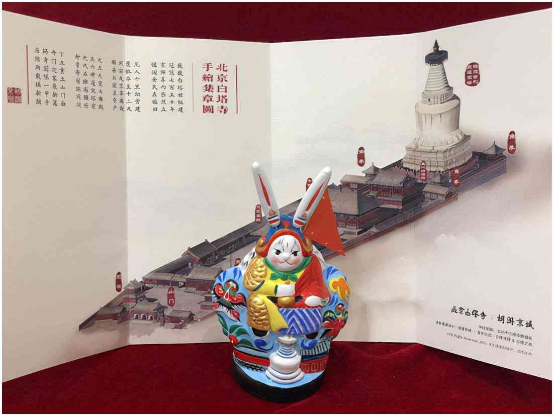 此兔儿爷严格按照民间传统泥彩塑工艺制作,以传统“山子”兔儿爷形象为基础,身披红袍金甲,背插单挑令旗,身下正中为妙应白塔,左右两侧为白塔寺标志性的红墙大殿,上方两侧为北京传统沙燕风筝造型。