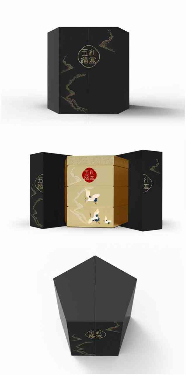 “五福礼盒”以三层五边形打造,整个设计灵感来源中国古代食盒设计,包装打开里边呈现出三层内盒,内装有5种杜仲产品。烫金工艺使得中国传统吉祥纹样鹤和云栩栩如生。