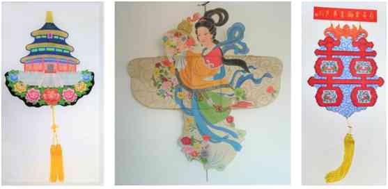风筝,历史悠久文化,底蕴深厚。三件作品分别为“百年华诞喜事多”为建党百年而作,名胜古迹“天坛”和民间故事“天女散花”;他们运用风筝工艺,集南北轧制的精华于一体,以选、扎、糊、绘、放的制作工艺制作而成。
