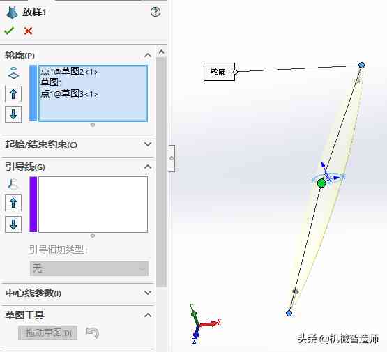 2、放样曲面,在新建的两个基准面上分别草绘一个点,在前视基准面上绘制一个椭圆,椭圆中心和两个草绘点在一个水平线上。