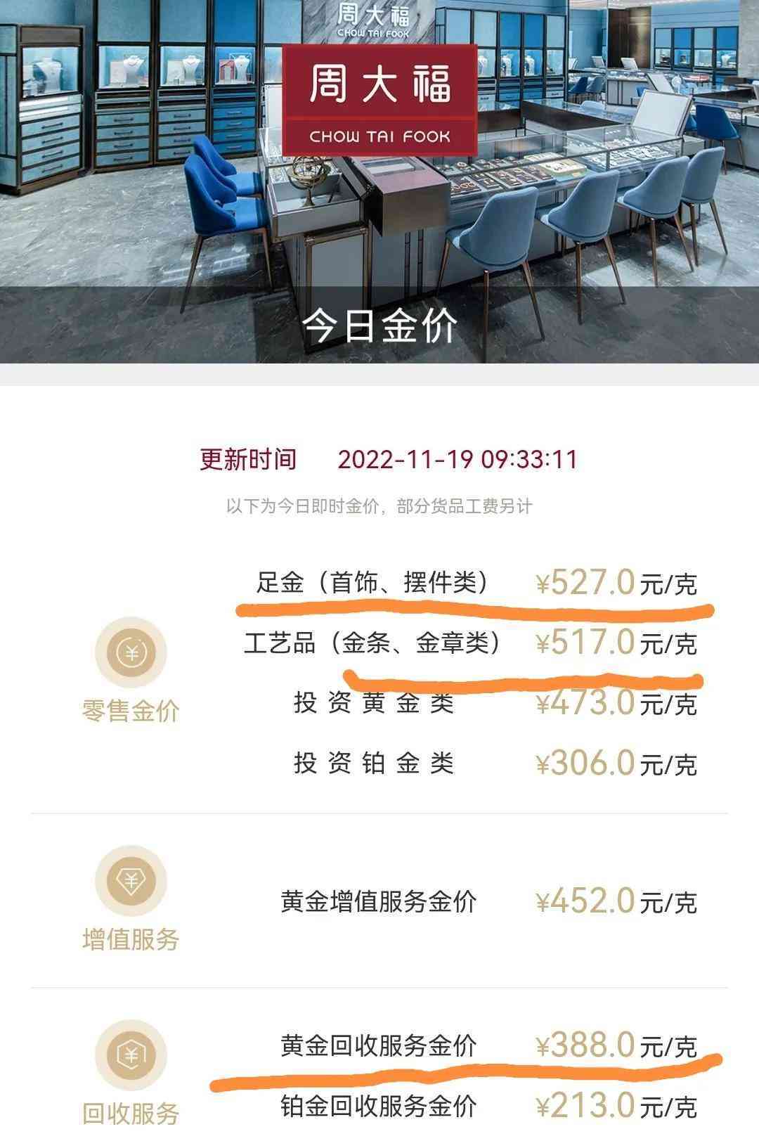 周大福官网金价今天是527元/克,足金回收价是388元/克