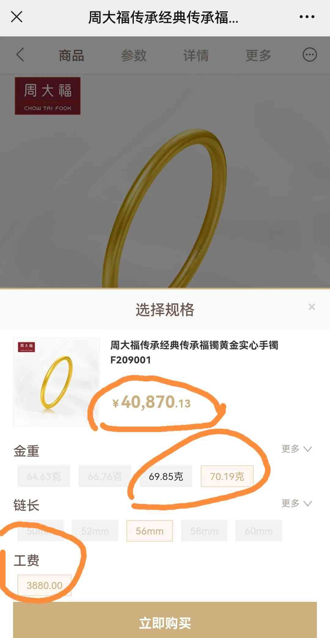 周大福官网这一款70.19克的足金传承黄金手镯工费是3880元。