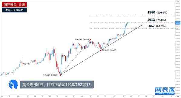 图为黄金日线走势图,黄金自3月中旬的大规模抛售以来沿趋势线持续走高,今日金价早盘迅速走高,目前正测试斐波那契78.6%延展位1913与历史高点1921组成的阻力区间,若金价突破该水平,未来或将进一步看涨至斐波那契100.0%延展位1980.