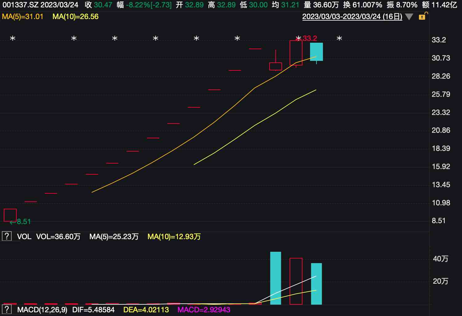 伴随金价上涨,A股黄金板块股价集体狂飙,3月3日登陆深交所的四川黄金更是其中的佼佼。其上市当日大涨44%后,连续拉出12个一字涨停板;短暂调整一日后,3月23日再次涨停;直至3月24日,也即上市第16个交易日,才收出上市以来的根阴线,报30.47元/股,跌8.22%。但即便如此,相较于发行价7.09元/股,累计涨幅高达329.76%。