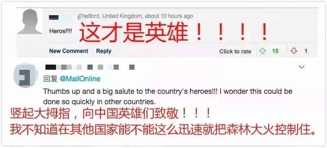 英国《每日邮报》称赞道:通过消防员的快速反应和持续努力,这场本可能演变成大灾难的森林大火被及时阻断。报道引用中国网友的话说:“为我们冲在线的消防员自豪,骄傲!”