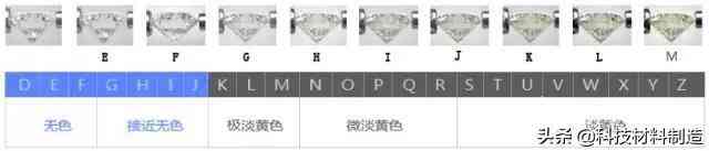 在鉴定钻石的颜色时,将鉴定的钻石与一套国际通用的标准比色石进行比较,标准比色石的颜色是按照从无色的D级(最高等级)到黄色的Z级次序来排列的。