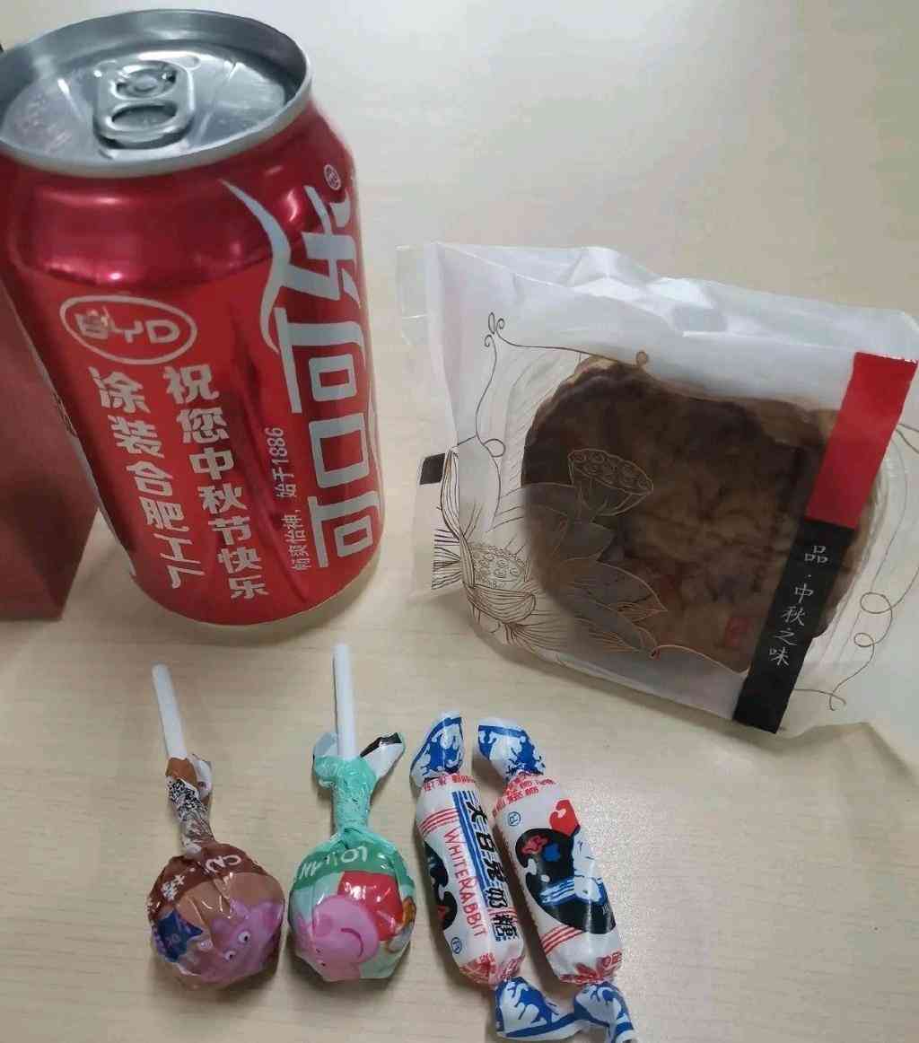 合肥工厂员工晒的中秋福利是一个月饼,一罐可乐,两个大白兔奶糖,两个棒棒糖。