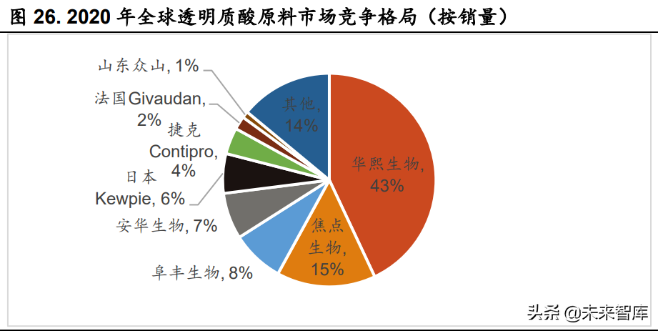 从竞争格局看,行业集中度较高,华熙生物稳居龙头地位。2020 年,全 球销量排名前五的透明质酸原料企业均为国内企业,华熙生物、焦点生物、 阜丰生物、安华生物销量占比分别为 43%/15%/8%/7%,合计占比 73%。国 内头部企业拥有领先的技术优势和规模化带来的成本优势,出口价格低于境 外公司同等产品,行业格局较为稳定。