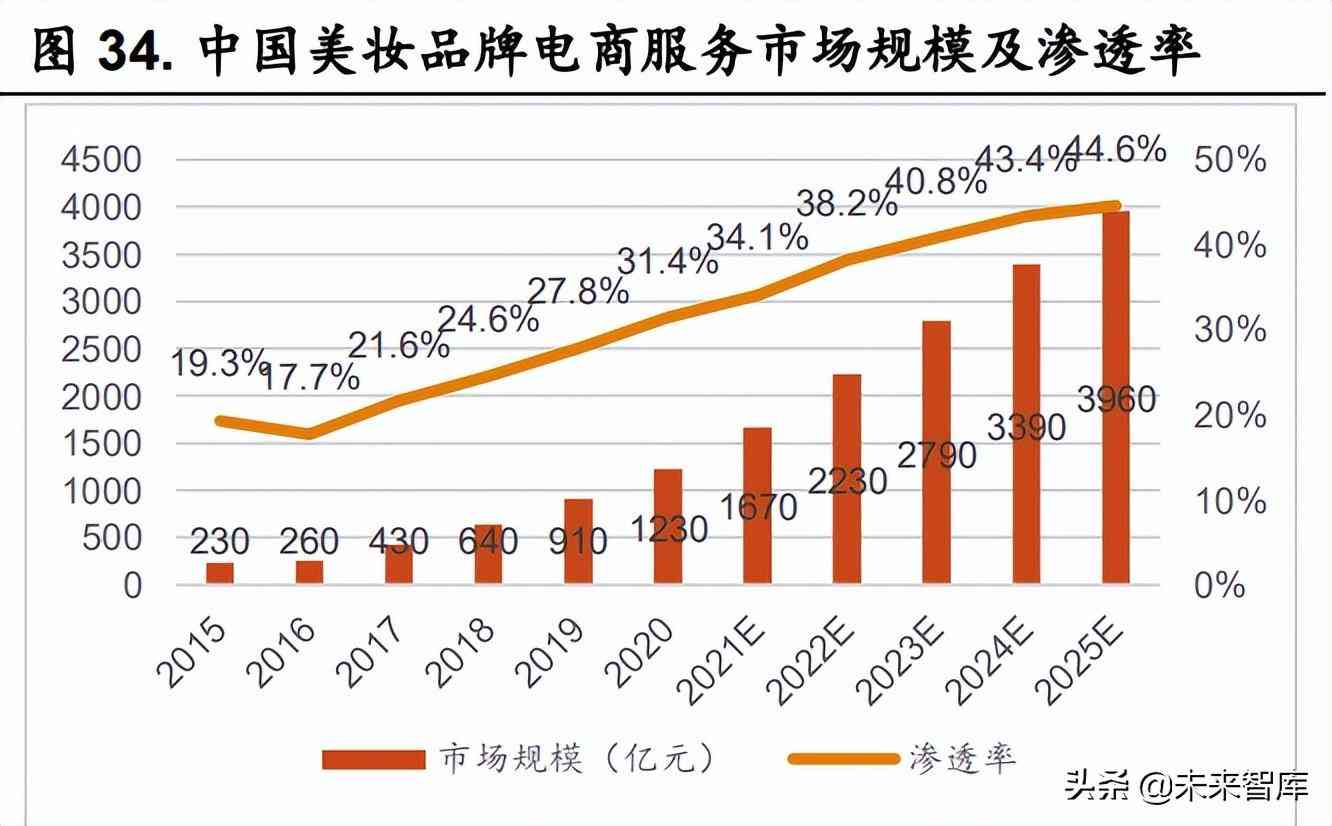 化妆品行业线上渠道兴起催生代运营商。根据 Euromonitor,2011-2020 年,化妆品线上渠道销售额占比由 5.3%提升至 38%,增长迅速,线上渠道 重要性提升。在此背景下,协助品牌线上运营的代运营业务增长较快。根据 悠可招股书,2015-2020 年,中国美妆品牌电商服务行业市场规模由 230 亿 元增长至 1230 亿元,复合年均增长率为 40.4%,预计 2025 年市场规模可达 3960 亿元,五年期复合年均增长率为 26.4%。
