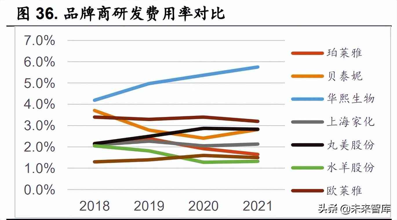 大单品多以有效的核心成分为切入点。诞生于 1982 年的雅诗兰黛小棕 瓶在矿物油护肤品时代创新性地添加超 9%二裂酵母提取液,打造细胞修复、 夜间修复的功效卖点和概念,并首次将玻尿酸作为保湿剂。产品还开创式地 采用微乳液配方(半透明外观、能够快速吸收的液体配方)、滴管式设计,创 造了“精华”这一品类。诞生于 2009 年的兰蔻小黑瓶同样以二裂酵母作为核 心成分,但通过添加羟乙基哌嗪乙烷磺酸、乙醇促进透皮吸收,主打渗透功 效和基因保养概念,品类定位于促进肌肤能更好地吸收精华的“肌底液”,差 异化定位使其与小棕瓶等精华品类形成一定的竞合关系。SK-II 神仙水的主 要成分 Pitera 是专利成分,具有帮助调节肌肤自然生理作用、舒缓日晒后的 肌肤、补充肌肤水分、调节皮脂平衡、光滑肌肤、提亮肤色、调节肌肤 PH 值 的护肤功效,这一成分自 1980 年沿用至今。过硬的产品力根植于研发端的 基础研究和配方开发。2021 年,欧莱雅、雅诗兰黛的研发费用分别约为 78.58 亿元、15.68 亿元,研发费用率 3.2%、1.5%。国内品牌商研发费用率已与国 际集团相当,但研发费用的投入量级仍有显著差距。